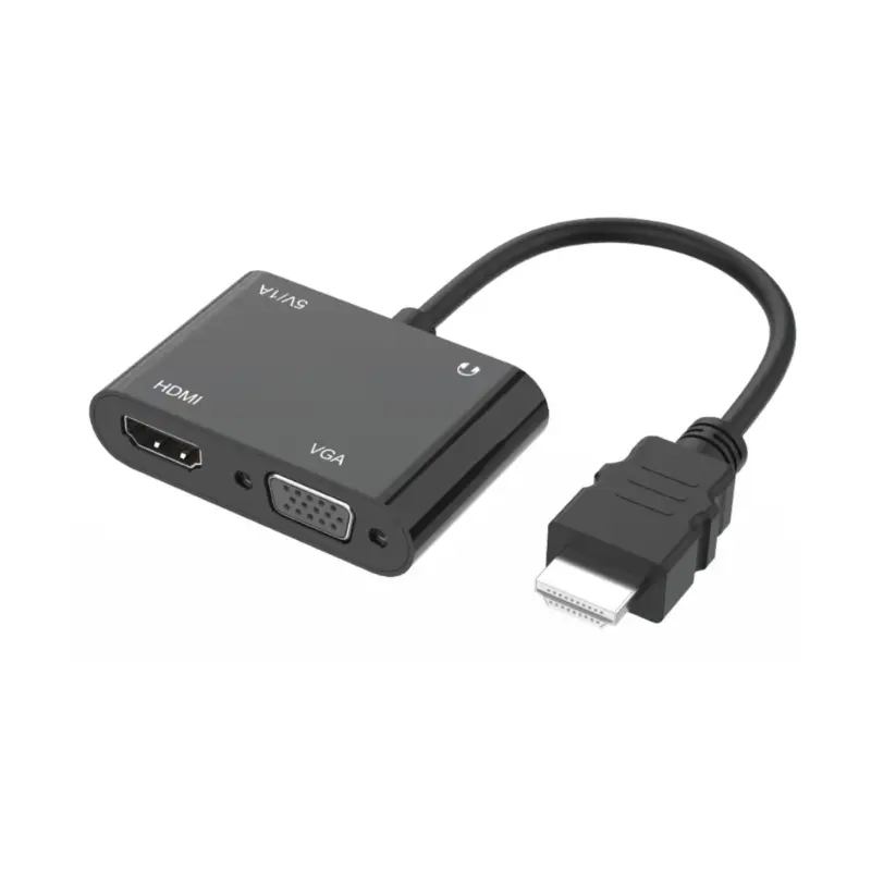 El adaptador HDMI a VGA/HDMI permite conectar notebooks, PC o dispositivos multimedia con salida HDMI a monitores, televisores o proyectores equipados con puertos VGA o HDMI. Ideal para entornos de oficina, presentaciones o uso doméstico, ofrece una conversión estable de imagen y sonido sin pérdida de calidad.