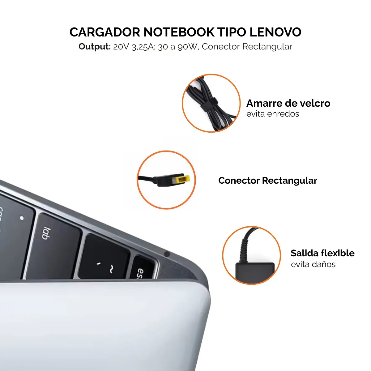 Diseñado para ser compatible con una gran variedad de modelos Lenovo, incluyendo IdeaPad Yoga (11, 11s, 13 Series), Carbon X1 y G405 Series. Su conector rectangular tipo Lenovo asegura un ajuste preciso y confiable.