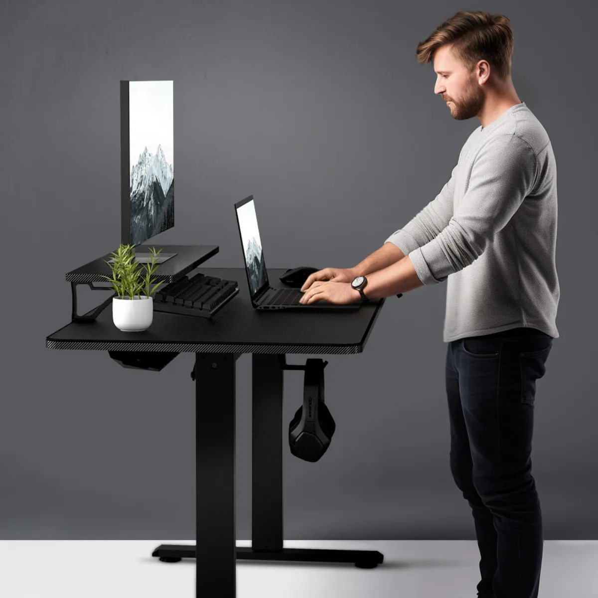 El sistema de elevación motorizado permite ajustar la altura entre 720 y 1170 mm, facilitando el uso tanto sentado como de pie. Incluye 2 preajustes de memoria para cambiar de posición con un solo toque, ayudando a reducir la fatiga y mejorar la postura durante largas sesiones.