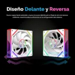 Este pack está compuesto por 1 ventilador principal y 2 auxiliares, con conectores macho/hembra en cadena que simplifican la instalación múltiple, evitando el desorden en el cableado. Además, su diseño con nueve aspas hacia adelante y nueve inversas distribuye el flujo de aire de manera uniforme, maximizando la eficiencia en la refrigeración del sistema.