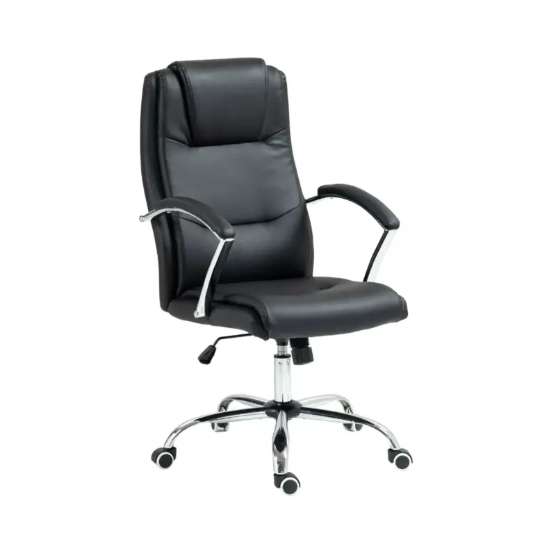 Con un respaldo alto y acolchado, reposabrazos confortables y un asiento amplio, esta silla ofrece soporte continuo incluso después de varias horas de uso. El tapizado en cuero sintético no solo aporta elegancia, sino que también es resistente y fácil de limpiar.