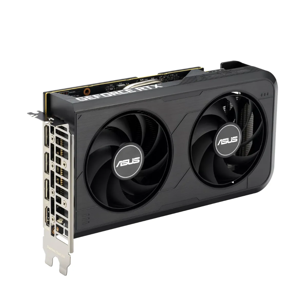 El sistema de refrigeración de doble ventilador Axial-tech de ASUS utiliza aspas más largas y un anillo de barrera que incrementa la presión del aire, maximizando el flujo hacia el disipador. Su diseño de 2 slots garantiza compatibilidad con gabinetes compactos (SFF).